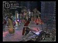 The game uses two gauges to measure the protagonist's health: hit points and vitality. The vitality gauge constantly drains during gameplay. If it empties, the hit point gauge will begin to drain.[2] Both gauges can be refilled by eating various forms of flesh and hearts to restore hit points and vitality respectively. If flesh or a heart is consumed while the relevant stat is filled to maximum, the protagonist's maximum hit points or vitality will increase by a fixed amount.[7] Alongside exploring the Neuro Tower, players can interact with non-playable characters in the one town outside the tower, being able to complete quests.[3][5] Portals found on each floor of the Neuro Tower will transport the player to the next floor.[8] A recurring element is item management, as the player has a limited inventory and can use, discard or throw items. Many consumable items are unidentified prior to eating them. Items thrown at enemies can cause damage depending on what they are.[6][7]