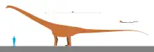 Barosaurus was an enormous animal, with some adults measuring about 25–27 m (82–89 ft) in length and weighing about 12–20 metric tons (13–22 short tons).[2][3][4] There are some indications of even larger individuals, such as the enormous cervical vertebra from the BYU 9024 specimen, which is 1.37 m (4.5 ft) long. Assuming it belongs to Barosaurus, this was an animal that was 48 m (157 ft) long and around 66 t (73 short tons) in weight making it one of the largest known dinosaurs, with a neck length of at least 15 m (49 ft) according to Mike Taylor.[5] In 2020 Molina-Perez and Larramendi estimated it to be slightly smaller at 45 m (148 ft) and 60 t (66 short tons).[6] However, abstracts from SVP indicate an assignment of BYU 9024 under Supersaurus.[7] Barosaurus was differently proportioned than its close relative Diplodocus, with a longer neck and shorter tail, but was about the same length overall. It was longer than Apatosaurus, but its skeleton was less robust.[8]