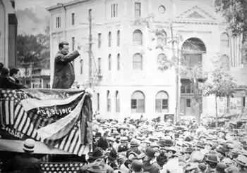 In the decades that followed, the opera house served as a venue for staged plays, speakers, traveling shows, bands, and politicians. People such as Helen Keller, Eugene V. Debs, George M. Cohan, Emma Goldman, John Philip Sousa and Tom Mix graced its stage.[3] In 1912, two presidential candidates made speeches from the outer balcony: William Howard Taft and Theodore Roosevelt.