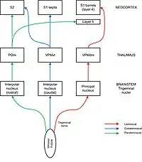 Sensory information flows from whisker follicles to barrel cortex via the trigeminal nerve nuclei and the thalamus. Barrel like divisions can be seen in some, but not all parts of the trigeminal nuclei (where they are called barrelets) and the thalamus (where they are called barreloids). The trigeminal nerve carries afferent fibres from the follicles into the brainstem where they connect to neurons in four different trigeminal nerve nuclei: principal, interpolar, oral, and caudal. Projections from the trigeminal nuclei to the thalamus are split into pathways designated lemniscal, extralemniscal, and paralemniscal. In the lemniscal pathway, axons from the principal trigeminal nucleus cross over the midline and project to “barreloids” in the thalamus, specifically in the dorsomedial section of the ventroposterior medial nucleus (VPMdm). Neurons in VPMdm project mainly to barrels in layer 4 of primary somatosensory cortex (S1). In the extralemniscal pathway, neurons of the interpolar nucleus project to the ventrolateral section of the ventroposterior medial nucleus (VPMvl). Neurons in VPMvl project to septa between the barrels and to secondary somatosensory cortex (S2). The paralemniscal pathway runs from the interpolar trigeminal nucleus via posterior nucleus (POm) of the thalamus to S2 and to diffuse targets in barrel cortex especially layer 5. Each pathway also has secondary projections to other layers within barrel cortex and other regions of cortex, including motor cortex.[7] These different pathways are thought to transmit different modalities of sensory information from the whisker.[2][8]