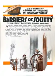 Barriers of Society is a 1916 American silent drama film directed by Lloyd B. Carleton. Universal based the film on the story written by Clarke Irvine and adapted for the screen by Fred Myton. The feature film stars Dorothy Davenport, Emory Johnson, and an all-star cast of Universal contract players.