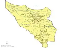 The municipality of San Juan is divided into 18 barrios, 16 of which fall within the former (until 1951) municipality of Río Piedras. Eight of the barrios are further divided into subbarrios,[1] and they include the two barrios that originally composed the municipality of San Juan (namely, San Juan Antiguo and Santurce):[2][3][4]