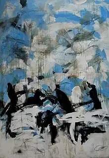 After his first solo show in 1989, Kamen began to hone his practise and his palette and style developed significantly. His next major series, ‘Caged Waits’ (1991–93), marks a radical reduction of his palette. The ‘Caged Waits’ works, large abstract works based loosely on the format of the human spine, are painted solely using sky blue, cream, black, coffee and graphite. This extraordinary series comprise Kamen’s best known works to date and can be found in many distinguished private collections. At this time, Kamen was beginning to incorporate the written word and script into his paintings and was inspired by the work of Cy Twombly, whose house he visited in Naples in the early 1990's and to whom he left a drawing; on receiving the drawing Twombly reportedly commented 'this boy can really draw'. The work Rien (1991), belonging to the legendary maverick British jewellery stylist Judy Blame, was exhibited in the Institute of Contemporary Arts in 2016 as part of Judy Blame’s major retrospective entitled ‘Never Again’. It was said to have been Blame’s most prized possession. Other works from these series can be found in the collections of Kate Moss, Tatjana Patitz, Johnny Depp, Naomi Campbell, Neneh Cherry, Jean-Paul Gaultier, Jean-Baptiste Mondino, Helmut Lang among others. Later major series included the 'History of England' series of 1993-4 in which Kamen explores British identity, politics and monarchy and 'And' series of 1997–1999, an extraordinary series of meticulous and detailed paintings of hands set against large, monumental crowd scenes taken from images of football crowds. He also consistently drew and painted his wife and muse Tatiana throughout his life.