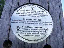 ![]() Plaque commemorating Barry Mason at the Sustrans portrait bench, Greenland Dock | |
