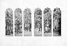 Upon its completion, the gymnasium contained a mural within the front entrance hall created by Frederic Clay Bartlett, brother of Frank. The mural depicts Athletic Games in the Middle Ages with the participants dressed in appropriate attire. The gym also included the Bartlett Memorial Window, presented to the university by William Gold Hibbard. The stained-glass was taken from Walter Scott's Ivanhoe and represents Rowena crowning Ivanhoe at the close of the second day's tournament at Ashby de la Zouch.[11] The window was designed and drawn by Edward P. Sperry, a close friend of Frederic Bartlett as well an associate of Louis Comfort Tiffany. Over 15,000 pieces of glass were used in the construction of the window. The window was placed above the main entrance of the gymnasium, facing Lexington Avenue.