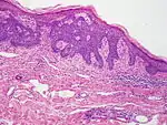 | Fibroepithelioma of Pinkus | Anastomosing epithelial strands in a fenestrated pattern[30] | Most commonly occurs on the lower back.[26]: 748 [27]: 648 | ![]() |