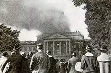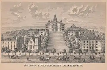 The university had its official beginnings when the Wisconsin Territorial Legislature in its 1838 session passed a law incorporating a "University of the Territory of Wisconsin", and a high-ranking Board of Visitors was appointed. However, this body (the predecessor of the U.W. board of regents) never actually accomplished anything before Wisconsin was incorporated as a state in 1848.[23] The Wisconsin Constitution provided for "the establishment of a state university, at or near the seat of state government..." and directed by the state legislature to be governed by a board of regents and administered by a Chancellor. On July 26, 1848, Nelson Dewey, Wisconsin's first governor, signed the act that formally created the University of Wisconsin.[24] John H. Lathrop became the university's first chancellor, in the fall of 1849.[25] With John W. Sterling as the university's first professor (mathematics), the first class of 17 students met at Madison Female Academy on February 5, 1849. A permanent campus site was soon selected: an area of 50 acres (20.2 ha) "bounded north by Fourth lake, east by a street to be opened at right angles with King street", [later State Street] "south by Mineral Point Road (University Avenue), and west by a carriage-way from said road to the lake." The regents' building plans called for a "main edifice fronting towards the Capitol, three stories high, surmounted by an observatory for astronomical observations."[26] This building, University Hall, now known as Bascom Hall, was finally completed in 1859. On October 10, 1916, a fire destroyed the building's dome, which was never replaced. North Hall, constructed in 1851, was actually the first building on campus. In 1854, Levi Booth and Charles T. Wakeley became the first graduates of the university, and in 1892 the university awarded its first PhD to future university president Charles R. Van Hise.[27]