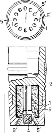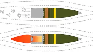 Base bleed or base burn[1] is a system used on some artillery shells to increase range, typically by about 20–35%. It expels gas into the low pressure area behind the shell to reduce base drag (it does not produce thrust; if it did it would be a rocket-assisted projectile). Since it extends the range by a percentage, it is more useful on longer range artillery where an increase of approximately 5–15 kilometres (3.1–9.3 mi) can be achieved, and it also was found that the reduced turbulence gave the projectiles a more consistent trajectory, resulting in tighter grouping and efficient shelling more than 40 km away.