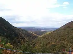 The waters of Bash Bish Falls begin at a spring in Mount Washington and after the falls, Bash Bish Brook has cut a 1,000 -foot deep valley on its way westward to adjacent New York State. The brook cuts between Bash Bish Mountain (elevation 1890) and Cedar Mountain (elevation 1883) creating a dramatic gorge that frames the falls.[2]