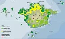 The province encompasses Basilan Island and all nearby offshore islands, together with the Pilas Island group (now Hadji Muhtamad Municipality) west of the island, and the Bubuan and Tapiantana Island group (now Tabuan-Lasa Municipality) in the south. These are listed among the Philippine islands with a moderate risk of getting hit by tsunamis. The province has a land area of 132,723 hectares (327,970 acres) under its jurisdiction.[2] Basilan Island itself has an area of 1,265.5 square kilometres (488.6 sq mi) and a shoreline of 169.8 kilometres (105.5 mi).[8]
