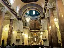 The origin of the location of the Basílica da Penha dates back to a small oratory located "Outside the Gate of Santo Antônio", corresponding, with a slight difference, to the plot of land where today the contemporary building is erected. The oratory was instituted in 1655 by the French Capuchin Franciscans and expanded on April 16 of the same year, in a plot donated by Belchior Alves Camello and his wife Joanna Bezerra. However, the present temple was constructed between the years of 1870 and 1882, being the only church in Corinthian style of the Pernambuco State. It is inspired by the architecture of the San Giorgio Maggiore church of Venice. In 1870, the Capuchins of Veneto (Italy) demolished the old Church of Penha and erected the imposing and current Basilica da Penha, concluding the work in 1882.[5] On September 2, 2007, a restoration work began that lasted until July 4, 2014, the date of its re-inauguration. The works cost about R$ 6 million and have not yet finished.[6] The work of the restorers revealed several features that had been lost by the passage of time. The original color of the gilded saint above the external dome has been restored and a vitrified panel of mosaic made in Italy has been found.[7] The church is known for the traditional event of the Blessing of Felix of Cantalice which took place close to the Basilica while the restoration lasted.[8]