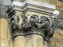 The architectural sculpture in the interior of the Basilica of Our Lady belongs to the highlights of Mosan art. The 20 highly symbolic capitals in the choir ambulatory depict scenes from the Old Testament, as well as various kinds of animals, monsters, birds, naked or scarcely dressed humans entangled in foliage, and humans fighting with animals. One capital in particular is famous as it was signed 'Heimo', probably by its maker who may also be represented on it, handing over a capital to the virgin Mary. The carved capitals and corbels of the choir gallery, as well as the capitals in the nave, are of a slightly later date and less vivid, depicting mainly foliage with some human and animal figures.[7] Most of the carved capitals, as well as some important reliefs elsewhere in the church, date from the second half of the 12th century. A close relationship has been established between the Romanesque sculpture in Our Lady's and that in the Basilica of Saint Servatius in Maastricht, the Church of St Peter in Utrecht and the Schwarzrheindorf double chapel in Bonn.[8]