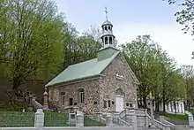 The Basilica of Sainte-Anne-de-Beaupré (French: Basilique Sainte-Anne-de-Beaupré) is a basilica set along the Saint Lawrence River in Quebec, Canada, 30 kilometres (19 mi) east of Quebec City, and one of the eight national shrines of Canada.[2] It has been credited by the Catholic Church with many miracles of curing the sick and disabled. It is an important Catholic sanctuary, which receives about a half-million pilgrims each year. Since 1933 they have included members of the Anna Fusco Pilgrimage from Connecticut, United States of America.[3] The peak period of pilgrimage is around July 26, the feast of Saint Anne, the patron saint of sailors.