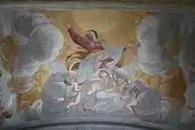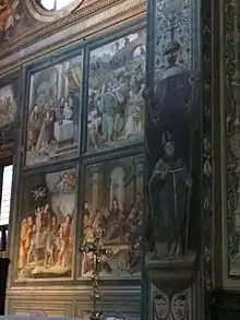 The walls under the cornice were also painted.[47] On the wall to the right of the altar are represented the Marriage of the Virgin, the Visitation of the Blessed Virgin Mary, the Adoration of the Shepherds and the Visit of the Magi.[48] The left wall is decorated with the Journey to Nazareth, the Purification of the Blessed Virgin Mary, the Massacre of the Innocents, the Return to Nazareth and the Dispute.[49] In this last scene there are portraits of Lanino and his helper, who lend their faces to some passers-by[58]. The triumphal arch is instead frescoed with angels in flight and with geometric motifs decorated with fruits.[3] The lapel of the fresco that gives towards the center of the church is instead painted with candelabra of fruit and vegetables, while on the space between the triumphal arch and the pylons of the building there are two roundels that are supported by angels having the face of two prophets.[3]