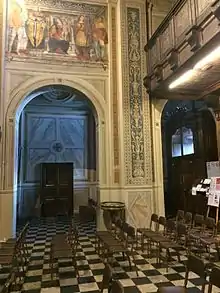 The choirs stalls, which are located inside the main chapel, were built in the 17th century in walnut wood by the Coiro brothers, or by the same carvers who carved the aforementioned small temple with a tabernacle in the sacristy.[40][41] The choir stalls, which are of fine artistic workmanship, have a Renaissance style.[40][42]
