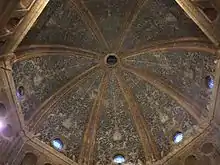 Just below the dome there is an octagonal tholobate which is frescoed with a softer shade than that of the vault: this is the opposite of what is generally done in the decorations of contemporary churches in the basilica, which are instead characterized by stronger colors in the lower parts and more tenuous in the upper architectural sections.[46] The tholobate is characterized by the presence of twenty-four niches which are internally painted with a gray shade and with a rather dark blue color, which brings out the penumbra originating from the recesses: on the pillars of the drum are represented candelabras, which take up the decoration of the vault.[46]