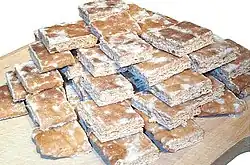 The Basler Läckerli (also Leckerli or Läggerli, lecker meaning "delicious" in German and -li being a diminutive suffix) is a traditional hard spice biscuit originating from Basel, Switzerland. It is made of honey, hazelnuts, almonds, candied peel, and Kirsch. After baking in a thin layer, the still hot dough is topped with a sugar glaze and cut into rectangular pieces.