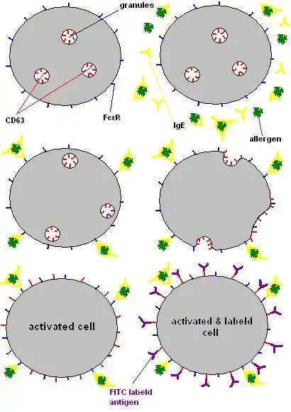 Degranulated cell expose CD63[2] molecules on their outer cell membrane, hence the granules, which contain CD63 molecules on their inner surface, merged with the cell membrane. The inner cell surface of the granules becomes the outer cell surface of the basophil /mast cell during degranulation process.