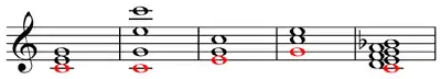 Examples with bass note in red: C major chord in root position close position (C), open position (C), first inversion (E), second inversion (G), and cluster on C (C).