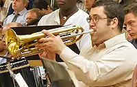 In jazz music, Johnny Mandel became well known as a bass trumpet player, as well as Cy Touff and Raymond Premru in the 1950s and 1960s.[5] Jazz trombonist Elliot Mason regularly plays the bass trumpet with Wynton Marsalis's Jazz at Lincoln Center Orchestra as well as in his own bands. Rashawn Ross regularly plays bass trumpet with the Dave Matthews Band and has performed and recorded with Usher, Ludacris, Maceo Parker, Robert Randolph, and Roy Hargrove. His equipment includes a silver-plated Getzen bass trumpet and a Vincent Bach Mount Vernon B♭ trumpet.