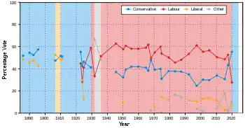 In the December 2019 general election, the Conservatives won the seat with a swing from Labour of 18.4%, the largest recorded in the election.[8] The fall in Labour's vote, 24.9%, was the greatest of any seat in the election.[9]