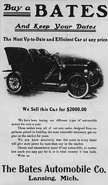 The Bates was an automobile manufactured in Lansing, Michigan, by the Bates Automobile Company from 1903 to 1905. The Bates was the brainchild of M.F. Bates, who was vice-president of the company.