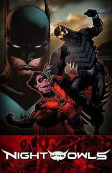 "Batman: Night of the Owls" is a comic book crossover storyline published by DC Comics in mid-2012, and featuring the Batman family of characters. Primarily written by Scott Snyder, the arc is the first major crossover storyline of The New 52.