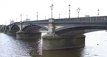 In an effort to improve the bridge's poor safety record for its customers, oil lamps were added to the deck in 1799, making Battersea Bridge the first Thames bridge to be lit.[16][17] Between 1821 and 1824 the flimsy wooden fences along the edges of the bridge, which were often breaking, were replaced by sturdy iron 4-foot (1.2 m) railings,[17] and in 1824 the oil lamps were themselves replaced by gas lighting.[16][17] In 1873, in an effort to improve navigation around the bridge and reduce accidents, two of the piers were removed, making the widest span a more easily navigated 77 feet (23 m), and the bridge deck was strengthened with iron girders to compensate for the missing piers.[18]