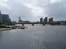 In 1806, a scheme was proposed by Ralph Dodd to open the south bank of the Thames opposite Westminster and London for development, by building a new major road from Hyde Park Corner to Kennington and Greenwich, crossing the river at Vauxhall, about halfway between Battersea Bridge and Westminster Bridge.[20] The Battersea Bridge Company were concerned about the potential loss of custom, and petitioned Parliament against the scheme, stating that "[Dodd] is a well known adventurer and Speculist, and the projector of numerous undertakings upon a large scale most if not all of which have failed",[n 5] and the bill was abandoned.[21] However, in 1809 a new bill was presented to Parliament for a bridge at Vauxhall, this time obliging the operators of the new bridge to compensate the Battersea Bridge Company for any losses, and the Company allowed it to pass and accepted compensation.[21] The Act obliged the Vauxhall Bridge Company to reimburse the Battersea Bridge Company for any loss in revenue caused by the new bridge.[22]