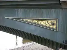 The contract to build the new bridge was awarded to John Mowlem & Co,[12] and in June 1887 the Duke of Clarence laid a ceremonial foundation stone in the southern abutment and construction work began.[17] Bazalgette's design incorporated five arches with cast iron griders, on granite piers which in turn rest on concrete foundations. The roadway itself is 24 feet (7.3 m) wide, and 8-foot (2.4 m) wide footpaths are cantilevered on either side of the bridge,[n 7] giving the bridge a total width of 40 feet (12 m).[12] The balustrade is a distinctive Moorish-style lattice.[38] Construction work was overseen by Bazalgette's son Edward, and cost a total of £143,000 (about £16,743,000 in 2023).[14][18]