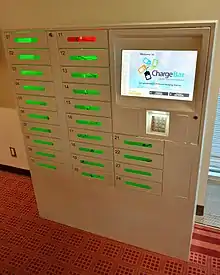 Charging state is typically indicated through four LED lamps for each quartal, whereas some higher-end models feature an exact percentage display.[19][20] Some power banks are able to deliver power wirelessly, some are equipped with an LED flashlight for casual near-distance illumination when necessary, and some have a pass-through charging feature which allows providing power through their USB ports while being charged themselves simultaneously.[21] Some larger power banks have DC connectors (or barrel connectors) for higher power demands such as laptop computers.