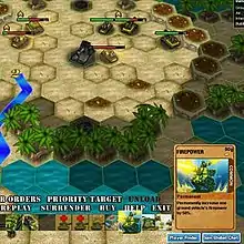 Battle Dex employs a "Wego" simultaneous execution system where turns are divided into a planning and executing phase. While the planning phase can, in single player mode, last as long as the player needs to give orders to all their units, turns in multiplayer games are usually limited to two minutes. Both sides, either computer or another human, enter their orders during the planning phase. During the execution phase, units carry out their orders, but the player cannot influence the result and is limited to watch, replay and move the camera.