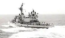 At approximately 17:00, USS Sterett detected three hostile aircraft approaching the navy ships. One of the MiG-17s scored a direct hit on USS Higbee with a BETAB-250 (250 kg; 550 lb) bomb, after failing to hit its target twice on two previous attack runs. The explosion destroyed the aft 5-inch (127 mm) gun mount which was empty, as the 12-man crew had been evacuated following a "hang fire" (a round stuck in one of the barrels).[2] Another MiG-17 simultaneously aimed its bombs at USS Oklahoma City but missed the target.[3] The U.S. claims that one of the MiGs was shot down by a Terrier surface-to-air missile from USS Sterett. One more MiG disappeared from Sterett's radar along with a Terrier missile fired at it from the frigate, indicating a probable kill.[2] A North Vietnamese Styx anti-ship missile was alleged to have been fired and intercepted, but this was not confirmed by official documentation.[4]