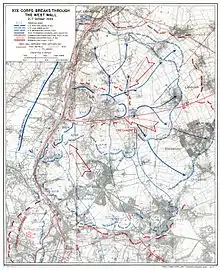 Aachen and its sector of the front were protected by the Siegfried Line, consisting of several belts of inter-connected pillboxes, forts, and bunkers protected by extensive minefields, "dragon's teeth" anti-tank obstacles, and barbed wire entanglements.[25] In several areas, German defenses were over 10 mi (16 km) deep.[26] Learning from their experiences on the Eastern Front, the Germans ran their main line of resistance down the center of towns located in the defensive wall, taking advantage of narrow streets to limit the mobility of enemy armored vehicles.[27] Despite the low quality of many of the troops manning them, the fortifications protecting Aachen and the Ruhr were a formidable obstacle to the progress of American forces,[28] who saw a breakthrough in this sector as crucial, as the terrain behind Aachen was generally flat, and therefore highly favorable to the motorized Allied armies.[29]