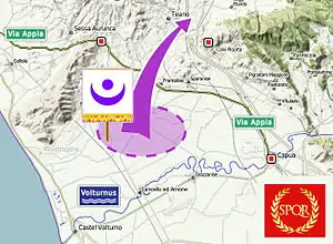 After leaving Arpi, Hannibal marched west into Samnium, and then moved to Beneventum, ravaging the countryside at will. Fabius cautiously followed the Carthaginians keeping to the high ground. From Beneventum, which had shut its gates against Hannibal, the Carthaginians moved north to capture a town called either Venosia[12] or Telesia.[13] From this place Hannibal struck south west towards Ager Falernus, a fertile river plain which lay on the south of Latium, and to the north of Capua. After going through Allifae, Callifae, across the Volturnus River to Cales, and then down on the plain the Carthaginians finally arrived near Casilinum.[14] Hannibal let loose his soldiers on the rich land, and all through the summer collected a rich booty of cattle, grain, supplies, and prisoners unhindered by Roman military activity. Hannibal had entered the potential trap because either his Italian guides had mistaken Casinum as Casilinum, or Campanian prisoners had suggested that Capua might defect once Carthaginians reached Campania, which did not materialise at this point of time.[14] It had also been suggested that Hannibal had invaded Ager Falernus to show the Italians the inability of Romans to defend their own property, after failing to get Fabius to fight.[15] There were eight possible routes out of Ager Falernus, but being positioned north of the Volturnus River, and with all the bridges in Roman hands, there were only three that Hannibal could take to leave the river plain.[16] Fabius seized this strategic opportunity presented to him and set about to trap the Carthaginian army.