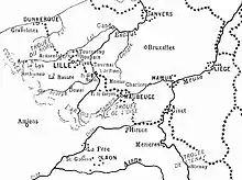 Orders came from Paris to abandon Lille, which was evacuated on 24 August and the 82nd Territorial Division formed a line from La Bassée to Corbehem, with the 81st Territorial Division forming a line from Aire to the sea. The Sixth Group of Reserve Divisions (also known as Groupe Ebener, with the 61st and 62d Reserve divisions) were sent from Paris, increasing d'Amade's force to six divisions, to hold a 70 mi (110 km) line from Douai to Béthune and Aire, to the sea, with another 25,000 troops of the Lille garrison.[2] On 25 August, the German II Corps advanced westwards through Denain, to get behind the left flank of the BEF and after dark reached the vicinity of Cambrai, where rearguards of the 84th Territorial Division defended the Sensée Canal at Bouchain, against a German attempt to cross. During 26 August, the division slowly retreated west of Cambrai; Groupe Ebener arrived at Marquion and were then ordered by Joffre to Combles and Péronne, to become part of the Sixth Army. The divisions retreated westwards, covered by the 84th Territorial Division, in actions which diverted part of the German II Corps from the BEF during the Battle of Le Cateau (26 August).[3]