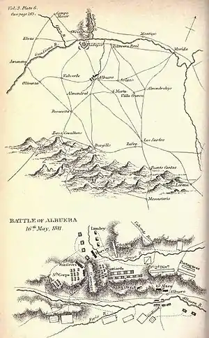 Beresford was alerted to the French advance by reports received on 12 May from Spanish patriots in Seville, who had sent word of Soult's departure. Beresford kept up the pretence of besieging Badajoz by sending an unsuccessful demand for surrender to the French commander on the afternoon of that same day, but he realized he would now not have time to finish the job, so he ordered the withdrawal of his siege guns and supplies.[45] On 13 May, the Spanish cavalry attached to Colborne's brigade came into contact with the French force and, in accordance with orders given by Wellington in April, they fell back while sending word of Soult's new position to Beresford. Later that day Long's British cavalry also encountered the advancing French and hastily pulled back—although Long, too, was following Wellington's orders not to engage, Beresford considered his withdrawal somewhat premature and thought Long could have delayed the French by forcing them to deploy.[46]