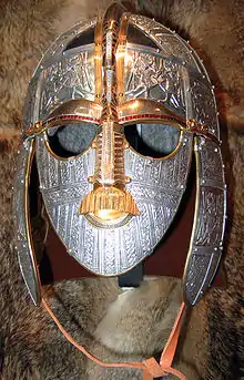 At this time of Strasbourg, the Alamanni confederation appears to have been under the presidency of two paramount kings, Chnodomar and Westralp.[16] Chnodomar was the driving force. A man of prodigious stature, strength and energy, he was nicknamed Gigas ("the Giant") by the Romans.[17] He was a formidable sight in his "flashing" helmet (probably gold-leafed) and full parade armour. He is described by Ammianus as the "evil mastermind" behind the invasion of Gaul.[18] Under the paramount king were 7 other kings (reges). It is possible that the petty kings (reguli) mentioned by Ammianus were the rulers of the pagi. Underneath the regal class were the nobles (called optimates by the Romans) and warriors (armati). The warriors consisted of professional warbands and levies of free men.[19] Each nobleman could raise an average of about 50 warriors.[20]