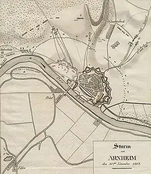 The Army of Bohemia under Karl Philipp, Prince of Schwarzenberg did not cross the Rhine until 20 December 1813 while the Army of Silesia under Gebhard Leberecht von Blücher crossed the river on 1 January 1814 and Wintzingerode on 6 January.[9] After Leipzig, Bernadotte took his army to north Germany intending to defeat the Kingdom of Denmark and force it to hand over Norway to Sweden. Though impatient to invade Holland, Bülow was unable to secure permission to do so until Great Britain put pressure on the Prussian government. In the meantime, Borstell's 5th Brigade was sent to blockade the fortress of Wesel.[10] On 23 November Bülow's 3,000-man advance guard led by Oppen invaded Holland and arrived before Doesburg on the IJssel. The town had been seized by Cossacks but later recovered by Amey's task force. Oppen stormed Doesburg without much trouble, capturing 112 French soldiers. On 24 November Bülow's forces secured the surrender of Zutphen, the same day that Benckendorff's force reached Amsterdam. Also on the 24th, Oppen drove Amey's column from Velp to Arnhem in a running skirmish.[11]