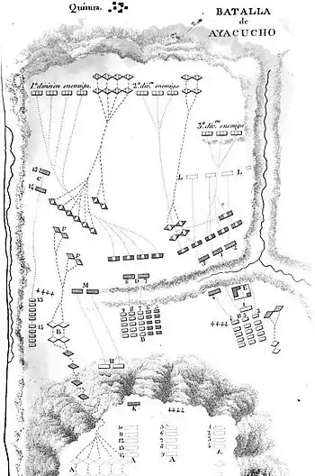 The plan, devised by Canterac, envisaged that the vanguard division would flank the enemy force, crossing the river Pampas to secure the units to the left of Sucre. Meanwhile, the rest of the royalist army would descend frontally from the Condorcunca hill, abandoning its defensive position on the high ground and charging against the main body of the enemy, which they expected to be disorganized. The 'Gerona' and 'Ferdinand VII' battalions served as reserves, deployed in a second line to be sent in wherever they were required.