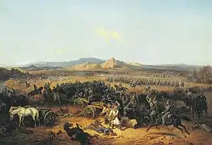 Just as it looked as if the Russian attack on the Turkish right wing would fail, General Bebutov arrived with two battalions of grenadiers from the reserve and renewed the attack. General Bagration-Mukhransky was able to regroup and lead his men to a position where he could hit the Turks in the flank. At the same time, Russian General Baggovut and his dragoons fought off the Turkish cavalry, crossed the river, and rode to the top of the plateau where they attacked the Turkish squares with their mobile guns. This led to the destruction of the squares and the capture of the full 20-gun battery. At that point, the entire right wing and part of the center of the Turkish defenses crumbled. The Turkish infantry then began to scatter and retreat.[2][3]