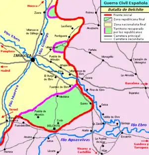 ![]() Progress of the Battle of Belchite with initial and final situations shown. | |||||||
