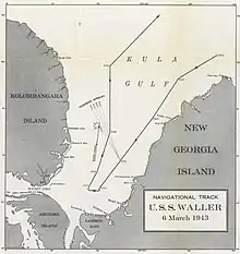 As the Japanese ships withdrew through the Kula Gulf after landing their cargo, they encountered Task Force 68 (TF 68), consisting of three light cruisers (USS Montpelier, Cleveland, and Denver) and three destroyers (USS Conway, Cony, and Waller) commanded by Rear Admiral Aaron S. Merrill. This force was en route to commence bombarding Japanese positions at Vila. Two submarines, Grayback and Grampus, had been assigned to support Merrill's force and were stationed along likely Japanese withdrawal routes out of the Kula Gulf. Merrill's attack on Vila was timed to coincide with another attack on Munda by four destroyers under Captain Robert Briscoe.[4]