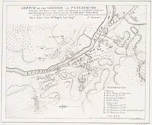 Shortly before sunset on 24 April, Phillips landed a force of 2,500 British and Hessian soldiers at City Point (now Hopewell), 12 miles (19 km) east of Petersburg.[2] As morning dawned the next day, four regiments of Muhlenberg's Virginia militia infantry formed two lines of defense and awaited the British force. The first line was composed of the regiments of Thomas Merriweather and John Dick, with Merriweather's anchoring the left of the line at the river, and Dick's the right, extending into the hills south of Blandford.[23] The second line, which was to form the main line of defense after the first one fell back, consisted of Ralph Faulkner's regiment on the left, and John Slaughter's on the right. The line extended along what is today Madison Street in Petersburg, from a causeway and bridge across the Lieutenant Run, a creek separating Petersburg and Blandford. The line was positioned to maximize the exposure of British troops to gunfire as they approached.[23] Von Steuben also placed one regiment on the north shore of the Appomattox River to guard against the possibility that the British landed on that side of the river.[24] He also positioned a small reserve force at the southern end of the Pocahontas Bridge, and Muhlenberg sent a company of Slaughter's men down the north bank to provide advance warning as the British approached.[23]
