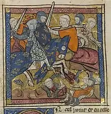 The French urban militia infantry, 2,150 strong, were gathered under the Oriflamme in the centre, in front of Philip's knights and the fleur-de-lis standard.[18] Soon after deploying, they were attacked by Allied knights and infantry under Otto and thrown back.[16] Otto and his knights had nearly reached the French king when they were halted by French knights.[19] The allied infantrymen broke through to Philip and his handful of knightly companions, unhorsing him with their hooked pikes. The French king's armour deflected an enemy lance and saved his life. Gales de Montigny used the royal standard to signal for help and another knight gave Philip a fresh horse.[20]