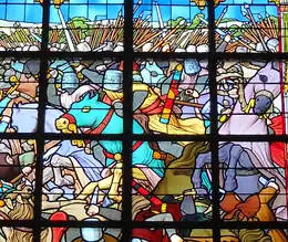 In thanksgiving for the victory, Philip Augustus founded the Abbey of Notre Dame de la Victoire, between Senlis and Mont l'Evêque.[34] In 1914, to mark the seventh centenary, Félix Dehau had the parish church of Bouvines rebuilt with a number of stained-glass windows representing the history of the battle.[35] In 2014, the eighth centenary was commemorated in Bouvines by an association called Bouvines 2014. A series of events, including an official ceremony and a show called "Bouvines la Bataille", attracted more than 6,000 viewers in Bouvines.[36]