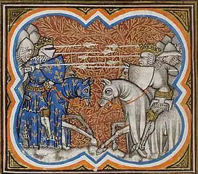 Chronicles from the French side describe the battle as a fierce and bloody one where Louis the Fat, despite his heavy weight, fought so close to the opposing knights that a Norman seized his horse's reins and shouted, "The King is taken!", to which the King replied with a heavy blow from his mace, shouting back: "The King is not taken, neither at war, nor at chess!" However, this was later proven to be a misattribution.[1]