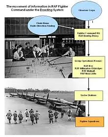 The Operations Room displayed various pieces of information in different ways, which the controller would then use in order to make his important decisions. The location of both enemy and friendly aircraft formations was displayed using numbered blocks on a map table. The current activities of No. 11 Group's squadrons e.g. "At Standby", "Enemy Sighted", "Ordered to Land", etc. were displayed on a "tote" board using a series of lights.[3] Current weather conditions at No. 11 Group's sector stations were indicated with a system of coloured discs. And the passage of time was tracked using a coordinated system of clock and coloured indicators.[4] All information was received from either Fighter Command headquarters or the sector stations via telephone.[5]
