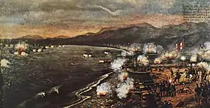 At 16:00, having been repelled the small Peruvian fleet under Lizardo Montero, which approached the Spanish twice, only 12 or 14 of Santa Rosa fort guns responded yet to the Spanish fire.[25] One of their shots hit the Blanca, killing 8 men and injuring Captain Topete.[25] At 17:00, nevertheless, Santa Rosa's guns had been reduced to three.[25][26] The badly wounded Admiral Méndez Núñez then ordered the fleet to suspend the fire.[23] The Spanish crews, having sustained heavy damage and it being impossible for them to fight any longer, retreated from the battlefield. The battle was finished. The badly battered Spanish ships remained for several days on San Lorenzo island, taking care of their wounded and their repairs.