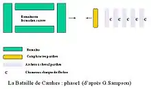 Crassus now hoped that his legionaries could hold out until the Parthians ran out of arrows.[28] However, Surena used thousands of camels to resupply his horse archers. Upon this realisation, Crassus dispatched his son Publius with 1,300 Gallic cavalry, 500 archers and eight cohorts of legionaries to drive off the horse archers. The horse archers feigned retreat and drew off Publius' force, which suffered heavy casualties from arrow fire.